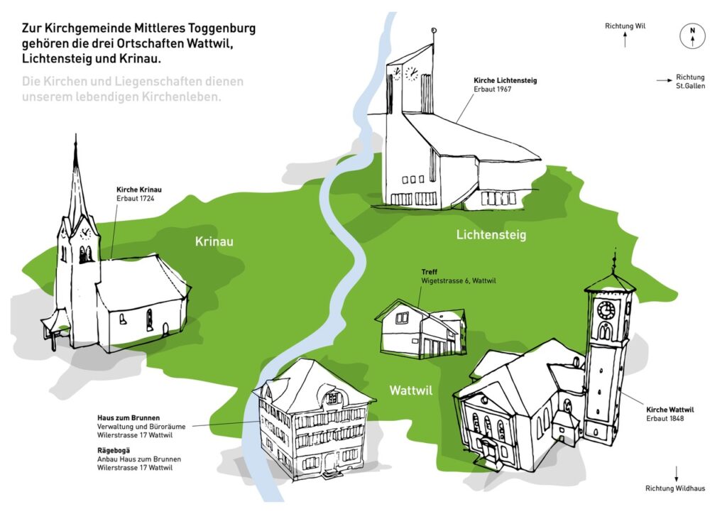 Die Kirchgemeinde hat mit den Kirchen in Wattwil, Lichtensteig und Krinau, zwei Pfarrhäusern und dem Verwaltungsgebäude «Haus zum Brunnen» einen umfangreichen Gebäudepark. Die Kirchenvorsteherschaft ist verantwortlich für die sachgemässe Instandhaltung und Sanierungen dieser Immobilien. Ebenso ist sie in der Pflicht, die für die Erfüllung der Kirchenaufgaben notwendigen Räume zu evaluieren und gegebenenfalls zu erweitern. Um diese Verantwortung wahrnehmen zu können, brauchte es eine Gebäudestrategie. Dieses umfangreiche von einem Architekturbüro erstellte Papier war im Oktober 2023 griffbereit.